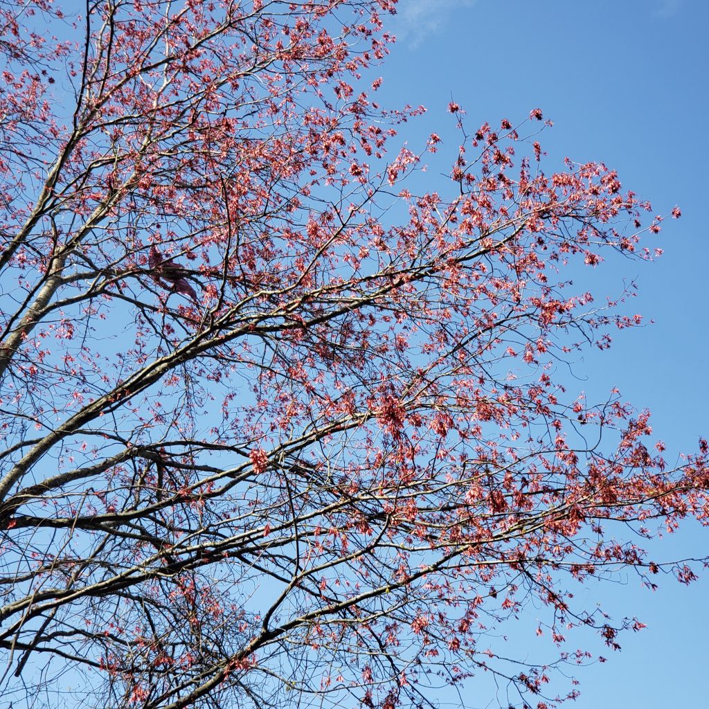 Recently I was walking along a trail I go down several times a week when for some reason I looked up and saw a red maple in full bloom.